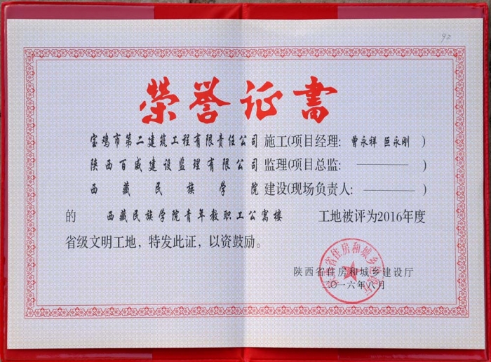 2016年省級文明工地(西藏民族學(xué)院證書)