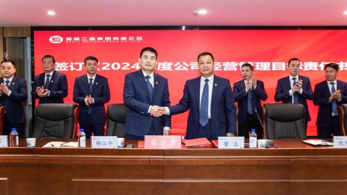 黨委書記、董事長胥立與黨委副書記、總經(jīng)理楊江平簽訂《2024年度經(jīng)營管理目標(biāo)責(zé)任書》。